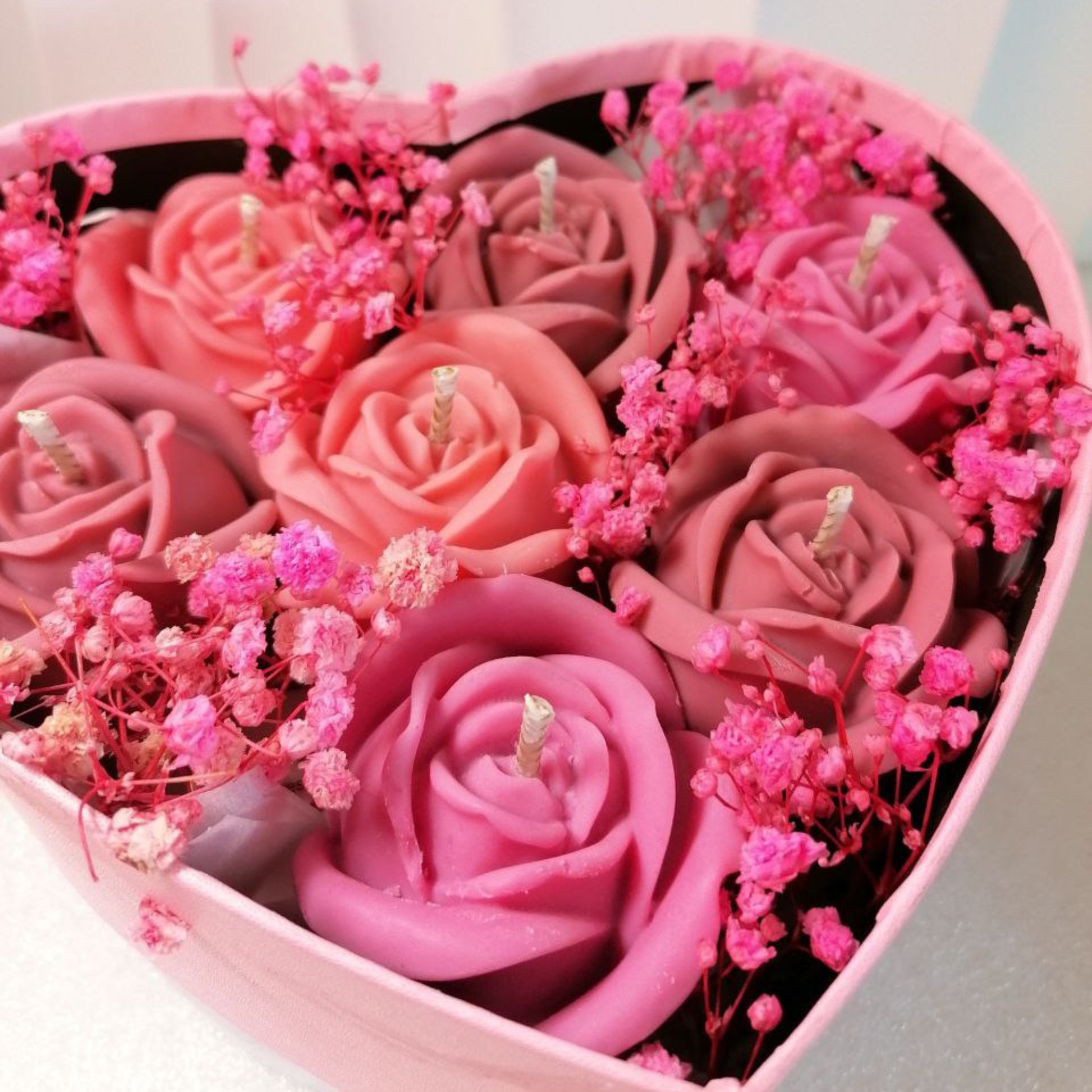 Rankų darbo žvakių rinkinys, suformuotas iš septynių subtilių rožių.